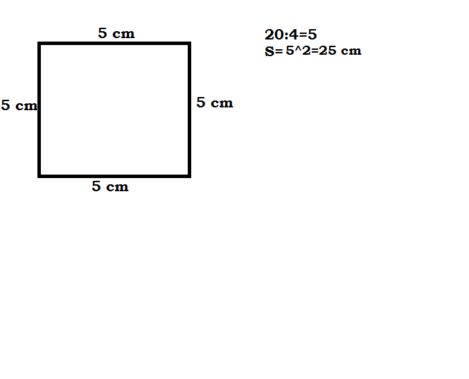 периметор квадрата равен 20см .найти его сторну. начерти квадрат обозначь буквами. найди его площадь