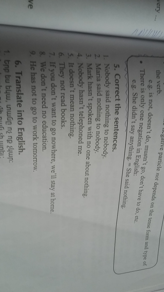 Nobody said anything to anybody 2 Maria said nothing to anybody 3Mark hasn't spoken to anyone about anything 4 Nobody has telephoned me 5 It doesn't mean anything 6 They don't read books 7 if you don't go anywhere we shall stay at home 8 we don't need any education 9 he hasn't to go to work tomorrow