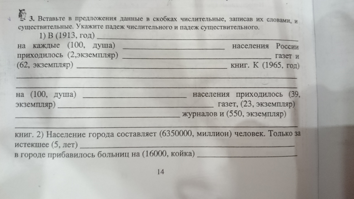 Вставьте в предложения числительные, записав их словами, и существительные. указать число и падеж существительного.