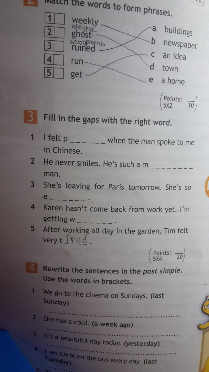 Помогите пожалуйста!! Номер 3!! Не знаю какие слова вставить! Первая буква у этих слов дана. 1. I felt p_ _ _ _ _ _ when the man spoke to me in Chinese. 2. He never smiles. He's such a m_ _ _ _ _ _ _ _ man. 3. She's leaving for Paris tomorrow. She's so e_ _ _ _ _ _. 4. Karen hasn't come back from work yet. I'm getting w_ _ _ _ _ _. Заранее спасибо!! ^-^