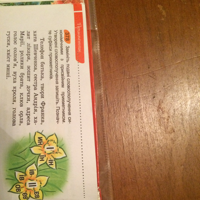 батьків телефон. Франкові твори. Шевченкова хата. Андрієва сестра. лікарів халат. доччин зошит. Маріїна адреса. братові ролики. орлиний клюв. солов'їний голос. кролячі вуха.гусяча голова. мишачий хвіст. але в деяких я не впевнена:)