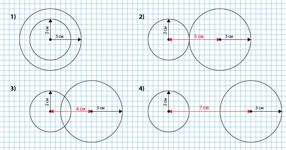 Начертите де окружности, радиусы которых 2 см 3 см, так, чтобы расстояние между их центрами было равно: 1) 0 см: 2) 5 см: 3) 4 см: 4) 7 см: