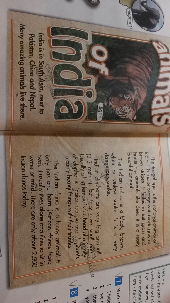 Бенгальский тигр это национальное животное Индии. Он красный или оранжевый с черными серыми или коричневыми полосками. Он прячется в высокой траве и охотится на больших животных таких как олень. Это по настоящему красивое животное.
