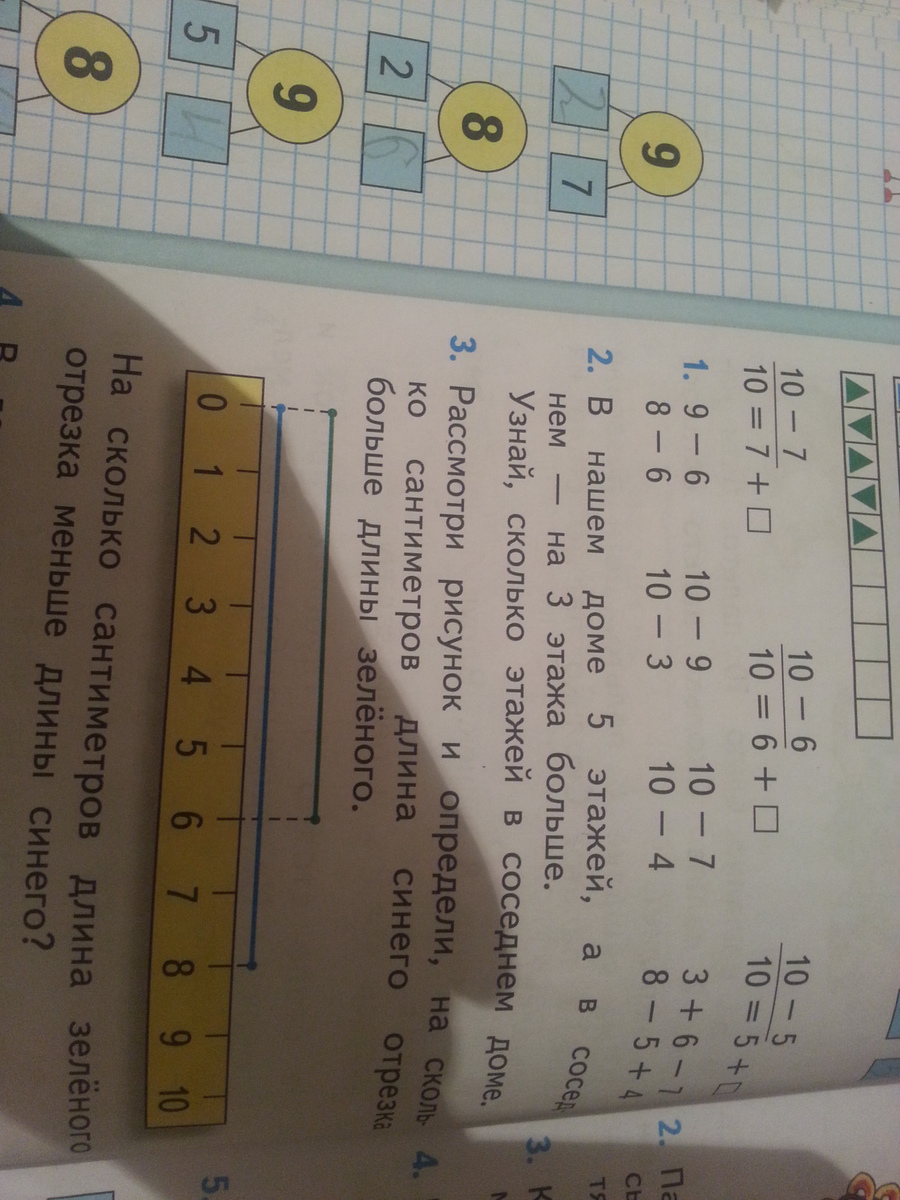 Ответ: Синий отрезок длиннее зеленого на 2 см, длина зеленого отрезка на 2 см меньше, чем длина синего отрезка.