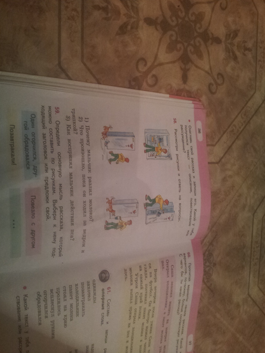 2)Когда мальчик пошел за ведром и тряпкой собака слизала молоко с пола.