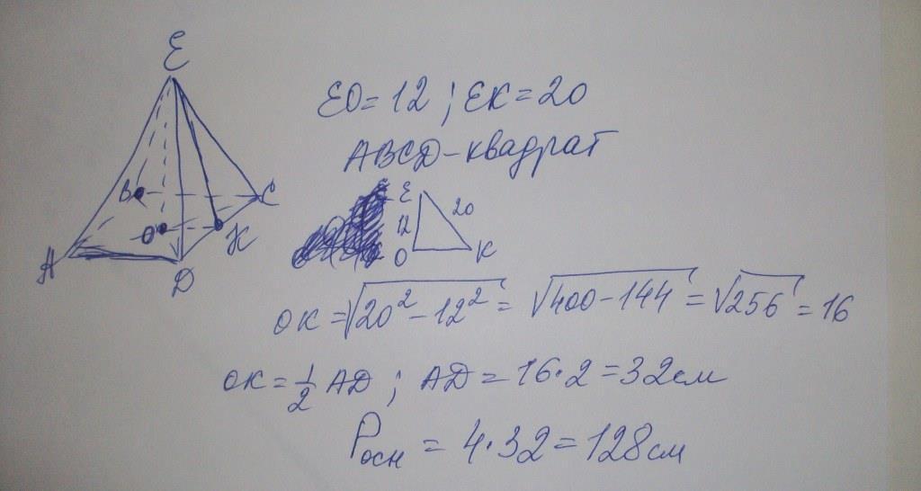 Дана правильная четырехугольная пирамида высота которой равна 12 см а апофема 20 см. Найти периметр основания