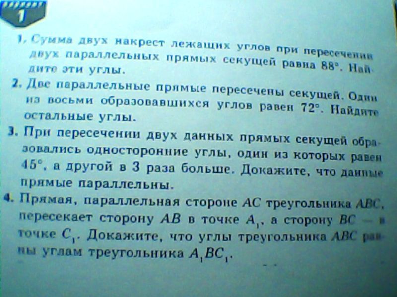 1)Накрест лежащие углы равны, значит угол 1=углу 2=88°/2=44°.