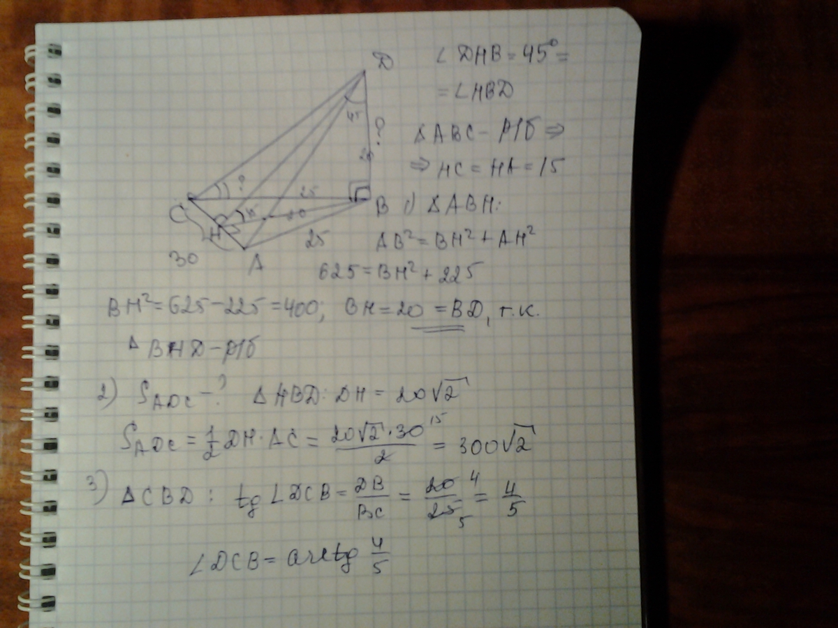 Через вершину В равнобедренного ΔАВС, у которого АС=30 см, АВ=ВС=25 см, к его плоскости проведен перпендикуляр ВD, а точка D соединена с вершинами А и С. Плоскости треугольников АDC и АВC образуют между собой угол 45°. Найти: длину перпендикуляра BD; площадь ΔАDС; угол между прямой CD и плоскостью ΔАВС.