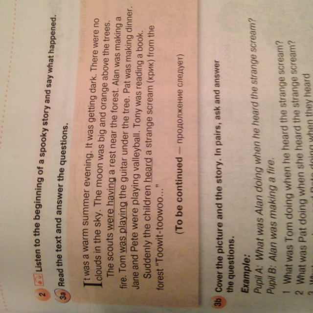 скауты отдыхали около леса. Алан рахводил костер. Том играл на гитаре под деревом. Пэт готовил ужин. Джэин и Пэти играли в волебол. Тони читал книгу. неожиданно дети услышали крик из леса...