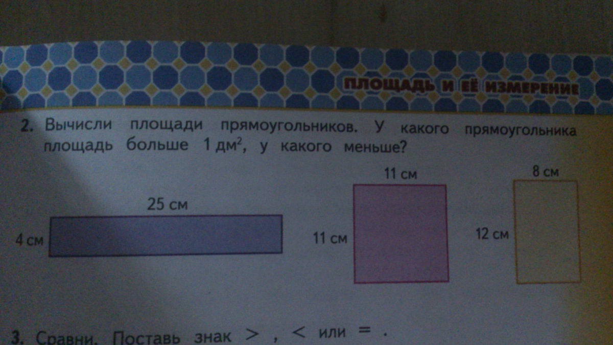 3 прямоугольник: 12*8=96 кв. см. или 9 кв. дм и 6 см.