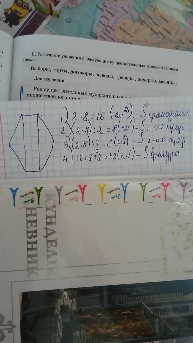 2) раздели его на прямоугольник и два треугольника и найди его площадь наиболее рационально