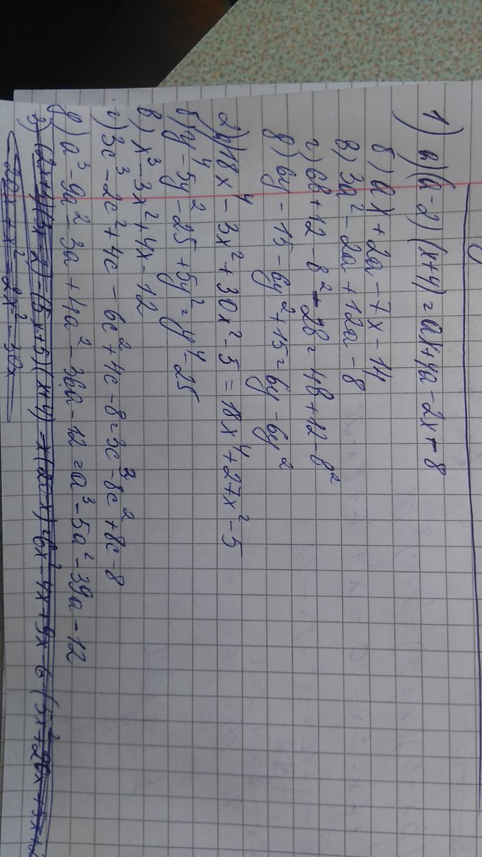 1. а)ax+4a-2x-8; б)ха-7х+2а-14; в)3а^2-2а+12а-8=3а^2+10а-8; г)6в+12-в^2-2в=4в+12в^2; д)6у-15-6у^2+15у=-6у^2+21у-15;