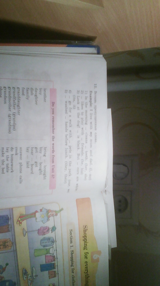 1)In the morning SHE cleans HER teeth2)HE likes to play with HIS friends3)Look at the dog! IT is black.But ITS ears are white4)WE go for a walk with OUR pets in the park.5)THEY washed THEIR hands before lunch