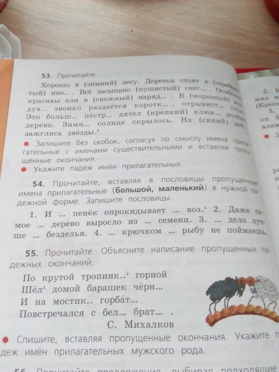 Хорошо в зимнем лесу. Деревья стоят в серебряном инее. Всё засыпано пушистым снегом. Особенно красивы ели в снежном наряде. В морозном воздухе звонко раздаётся короткий, отрывистый стук. Это большой пёстрый дятел крепкий клюв долбит дерево. Зимнее солнце скрылось. На синем небе зажглись звёзды.