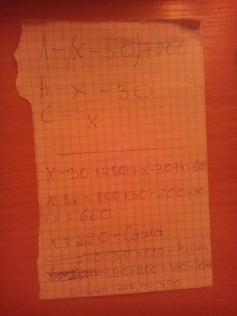 лера, алина и саша пошли за ягодой. лера собрала на 200 грамм больше чем алина, а алина на 30 грамм меньше чем саша. вместе они собрали 800 грамм. сколько собрала каждая из девочек?