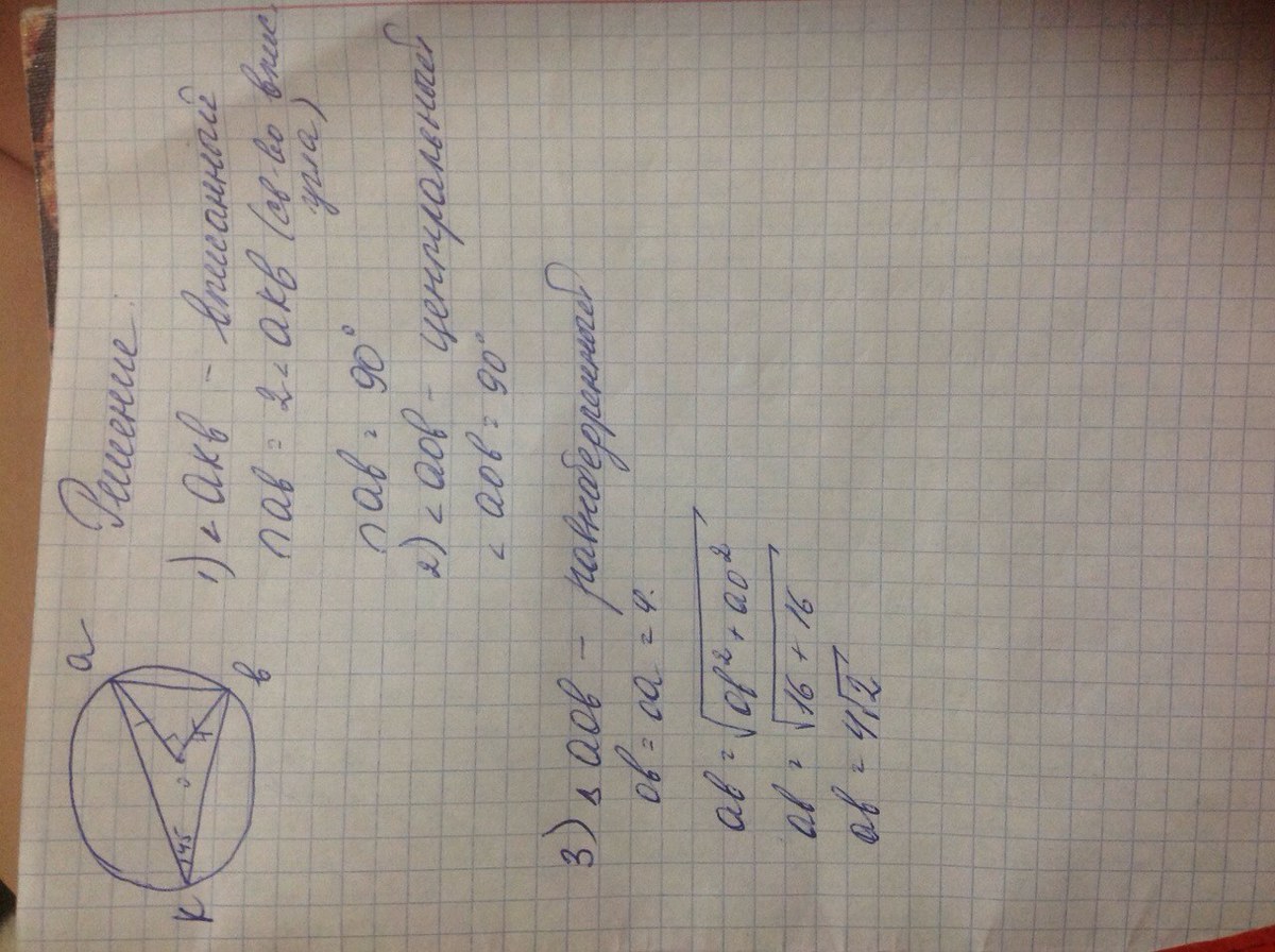 ka и kb хорды окружности с центром в точке о угол akb=45. Найдите длину хорды ab если радиус окружности равен 4
