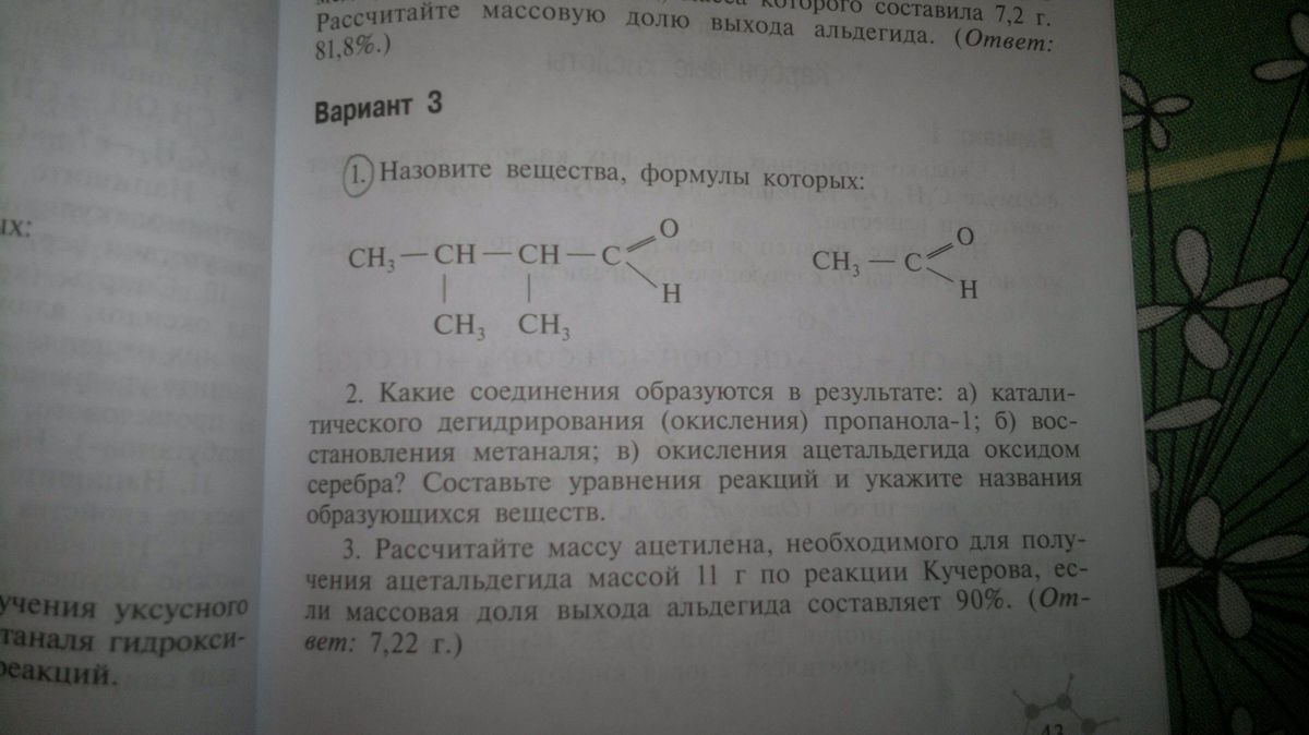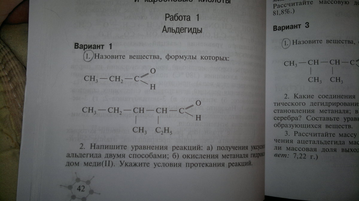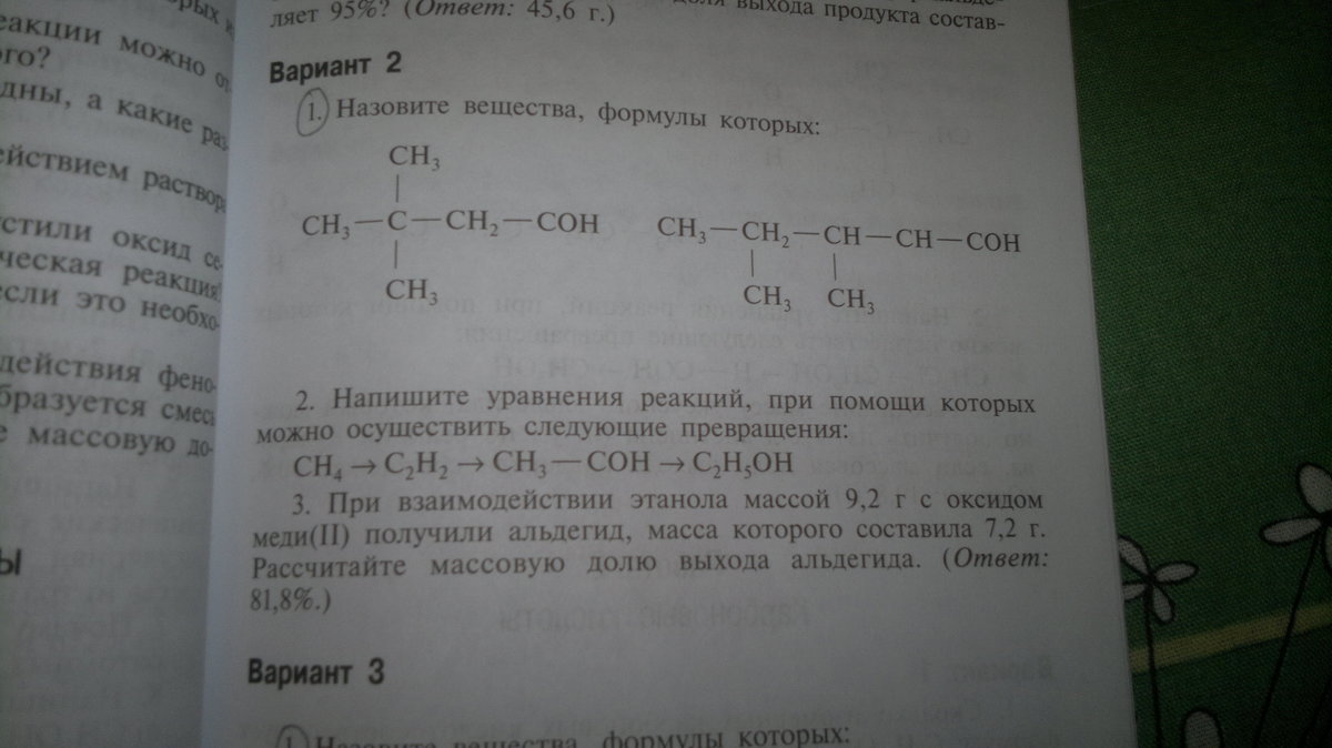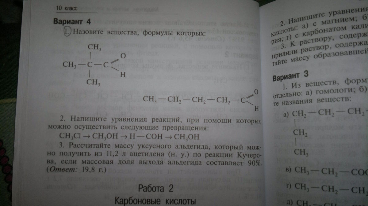 Вариант 2. 1. 3,3-диметилбутаналь ; 3,4-диметилпентаналь. Вариант 3. 1. 2,3-диметилбутаналь ; этаналь. Вариань 4. 1. 2,2-диметилпропаналь ; н-пентаналь. Вариант 1[4-ый файл]. 1. Пропаналь ; 2-этил-3-метилпентаналь. 3. а) 2-метилпропанол-2 ; б) 3-метилпентанол-3 ; в) 3-этилпентанол-2.