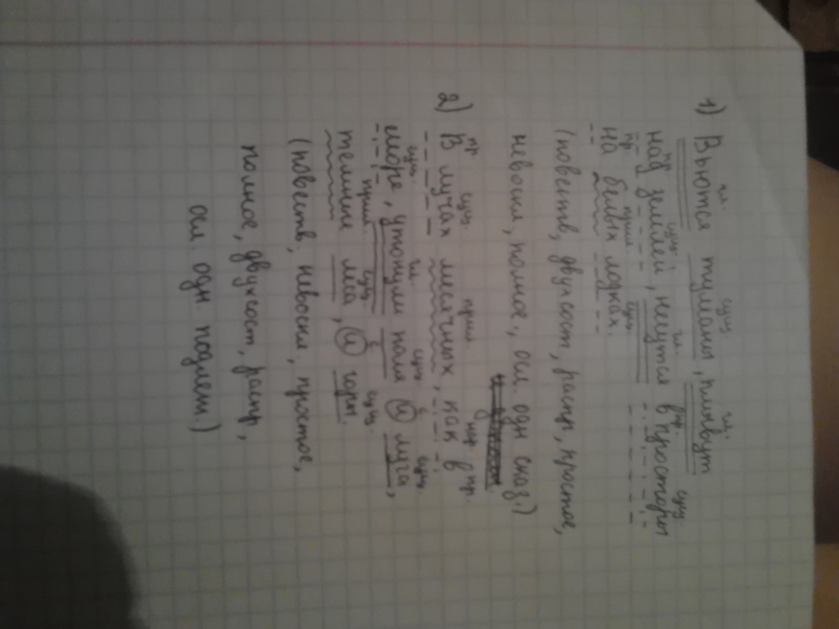 Синтаксический разбор предложения: 1) Вьются туманы, плывут над землёй,несутся в просторы на белых лодках. 2) В лучах месячных, как в море, утонули поля, и луга, темные леса, и горы