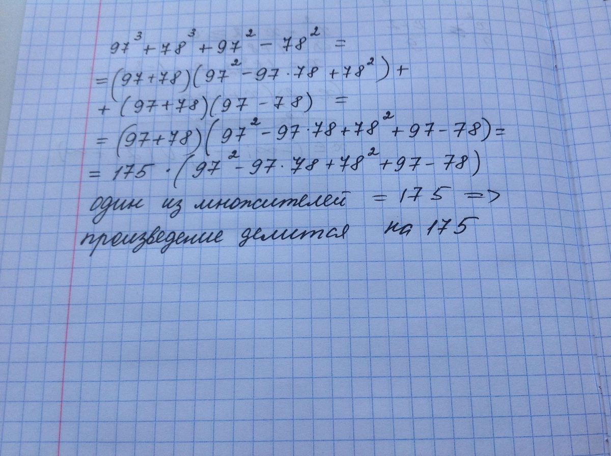 Доказать, что 97 в 3 степени + 78 в 3 степени + 97 во 2 степени - 78 в 2 степени делиться на 175