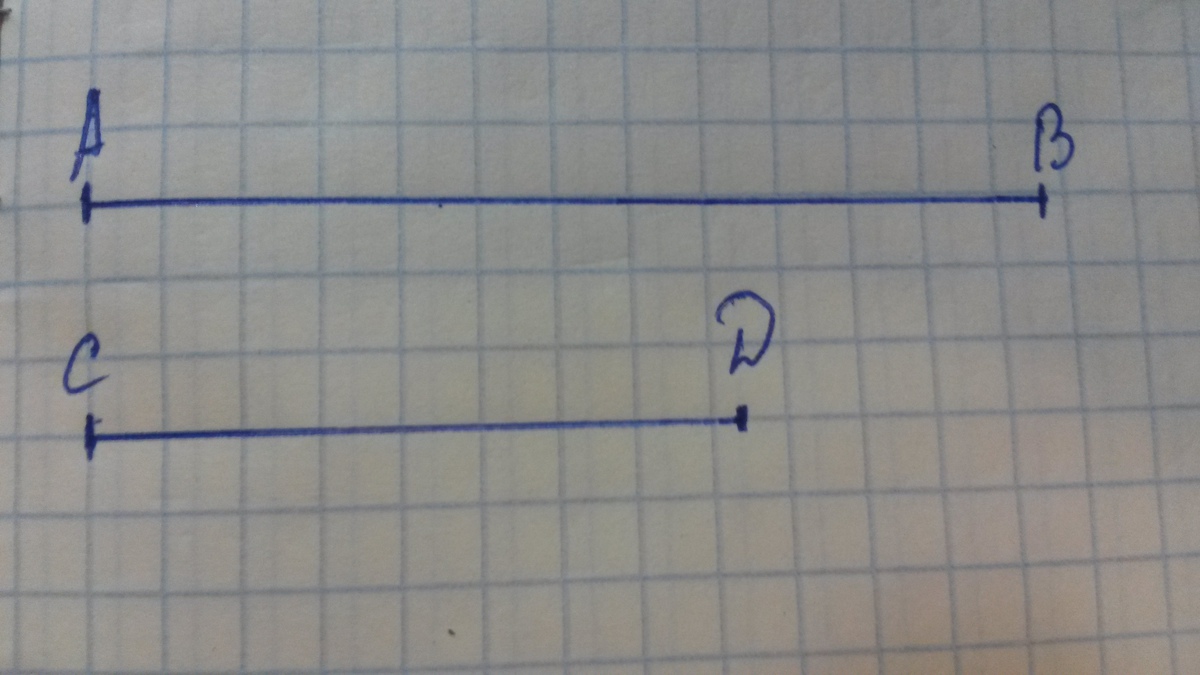 Отрезок AB равен 6целых три десятых см, а отрезок CD составляет 2третих от длины отрезка AB. На сколько отрезок CD короче отрезка AB? Начерти эти отрезки. Пожалуста помогите срочно.