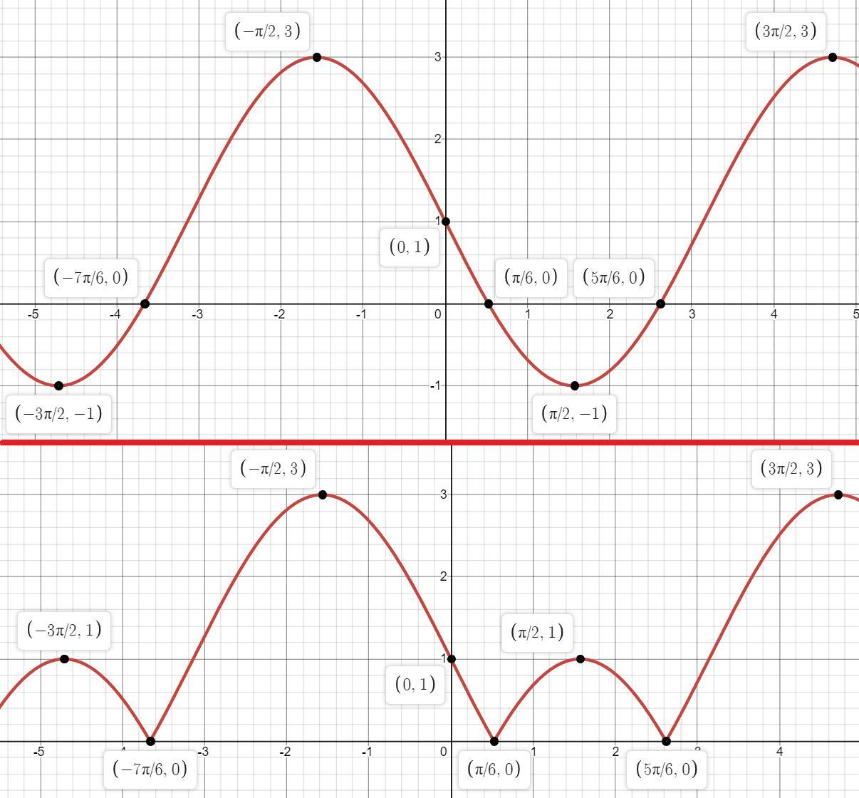 Что же сделает модуль с нашей функцией? Абсциссы точек ни как не изменятся, а вот их ординаты станут положительными т.к. чтобы не выдала нам функция y= -2sinx+1 любое её значение модуль сделает положительным, получается, что всё что снизу оси Ох мы зеркально оси Ох переносим на верх.