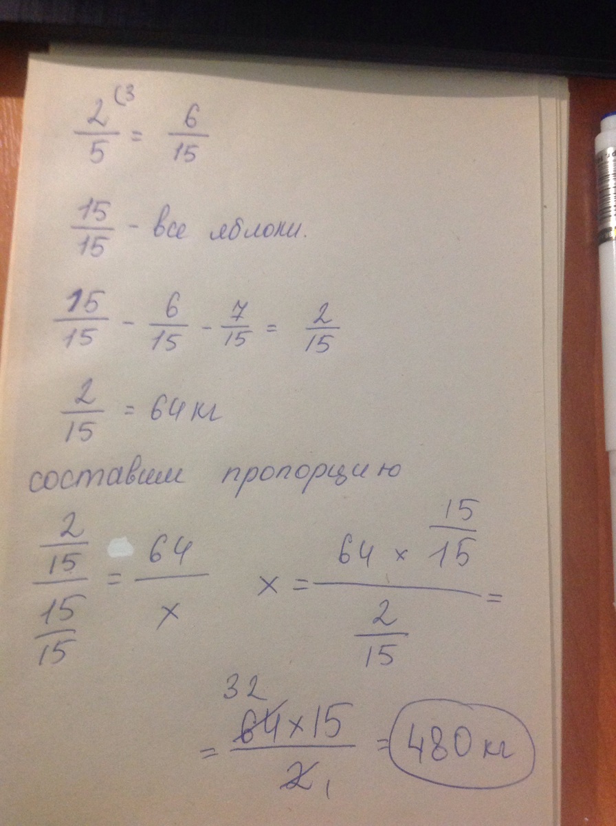 В 1-Й деь было продано 2/5 тых всех яблок во второй 7/15 тых остатка а в 3 день осталые 64 кг сколько кг яблок было завезено в магазин?