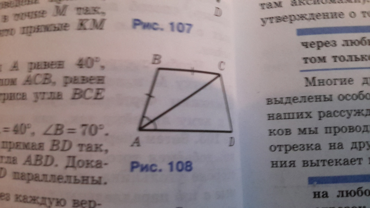 В четырехугольнике ABCD (рис 108 в учебнике) АС-биссектриса угла А, AB=BC. Докажите, что AD параллельна BC.