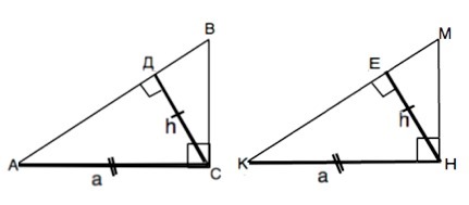 Обозначим треугольники АВС и КМН, в которых ∠С=∠Н=90°, катеты АС=КН и высоты СД=НЕ.
