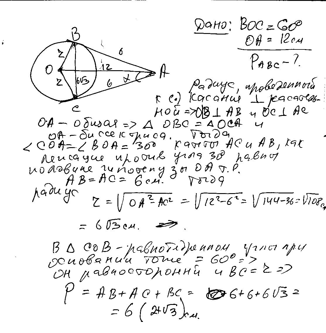 из точки А с окружностью с центром О проведены касательная АВ и АС ( В и С - точки касания ). Найдите периметр треугольника АВС , если ОА =12 см, а угол ВОС =60 градусам