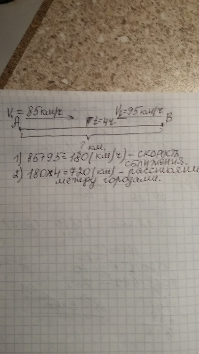из двух городов навстречу друг другу одновременно выехали два мотоциклиста.встретились они через 4 часа.скорость одного 85 км в час,скорость другова 95 км в час.какого расстояние между городами?нарисовать чертеж