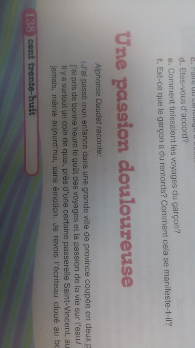 .Alphonse Daudet raconte qu'il a passé son enfance dans une grande ville de province coupée en deux. Il a pris très tôt la passion des voyages et de la vie sur l'eau. Il dit qu'il ne pense jamais sans émotion à ce coin de quai, près d'une certaine passerelle Saint-Vincent. Il raconte qu'il revoit l'écriteau cloué au bout d'une vergue.