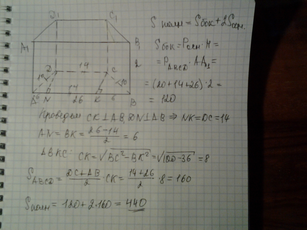 боковое ребро прямой призмы равна 2,основание- равнобедренная трапеция,боковая сторона которой равна 10,а основания равны 14 и 26. Найдите площадь полной поаерхности призмы.