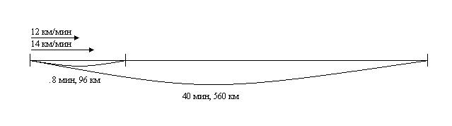 За 8 мин пролетел 96 км, его скорость 96/8 = 12 км/мин.