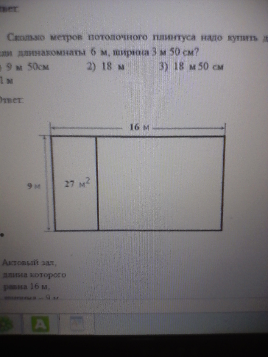 Сколько метров потолочного плинтуса надо купить для комнаты,если длинна комнаты 6м, ширина 3м 50см?