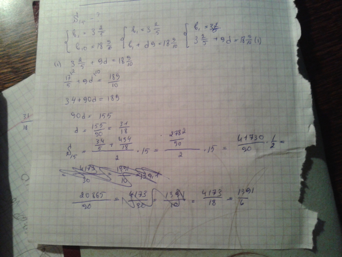 Найдите сумму первых пятнадцати членов арифметической прогрессии.(в n), если в1=3 2/5 и в10=18 9/10