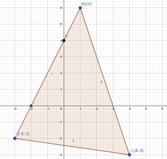 Построенный треугольник АВС по координатам его вершин смотрите на фотографии. Из рисунка видим, что координаты пересечения стороны АВ с осями координат, то есть, с осью Оу и Ох равны D(0;4) и E(-2;0) соответственно .