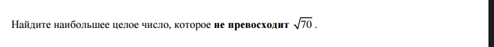 Вроди бы 8^2=64, 9^2=81, 64<70<81 => 8<sqrt(70)<9 => ответ: 8 так