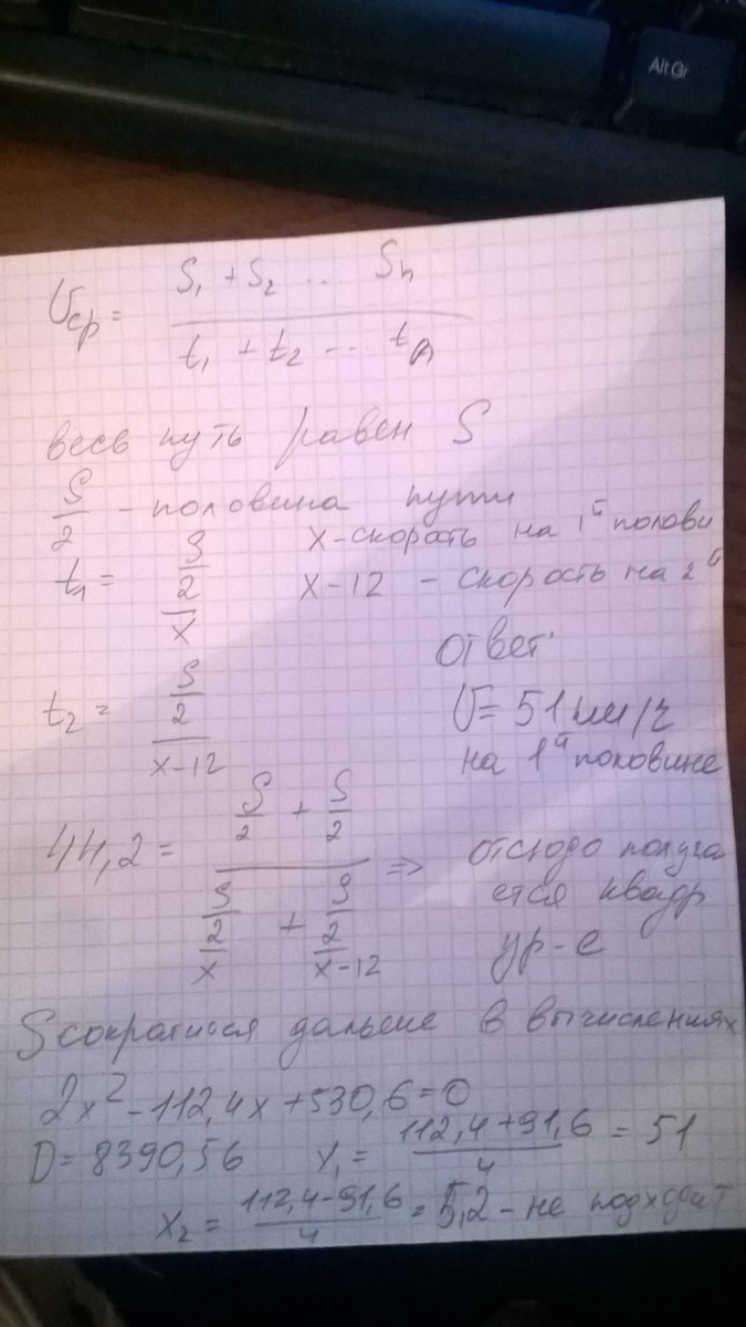 Мотоциклист половину пути проехал с некоторой постоянной скоростью, а затем снизил скорость на 12 км/ч. Какова была скорсоть мотоциклиста на первой половине пути, если известно, что средняя скорость на всём пути составила 44,2 км/ч