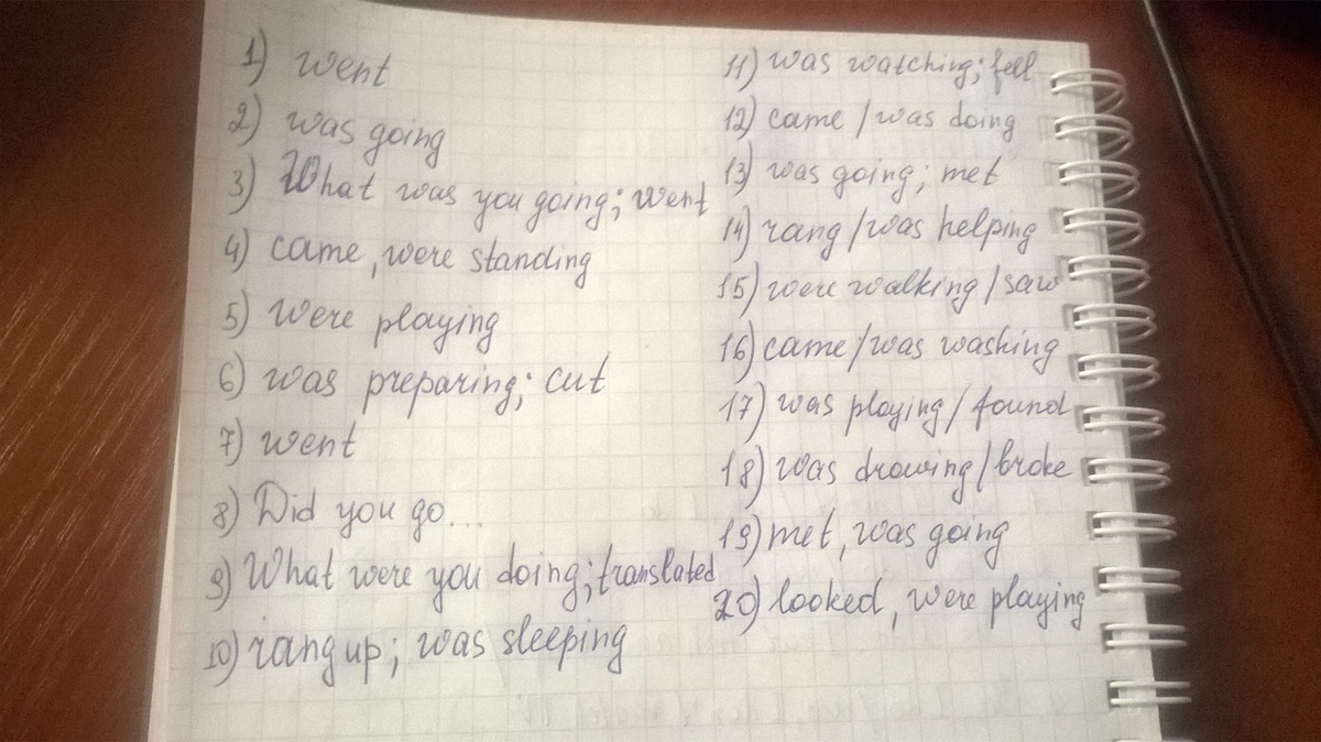 1. I (to go) to the theatre yesterday. 2. At seven o'clock yesterday I (to go) to the theatre. 3. What you (to do) at 5 o'clock yesterday? - I (to play) the piano. 4. When I (to come) to school, the children (to stand) near the classroom. 5. We (to play) in the yard the whole evening yesterday. 6. When I (to prepare) breakfast in the morning, I (to cut) my finger. 7. Last year I (to go) to the United States. 8. You (to go) to Great Britain last year? - No, I (to go) to France. 9. What you (to do) yesterday? - I (to translate) a very long article. 10. When I (to ring) up my friend, he (to sleep). 11. While my grandfather (to watch) TV, he (to fall) asleep. 12. When my friend (to come) to see me, I (to do) my homework. 13. When I (to go) to the stadium, I (to meet) Kate and Ann. 14. When Nick (to ring) me up yesterday, I (to help) mother. 15. When the children (to walk) through the wood, they (to see) a fox. 16. When I (to come) home, my sister (to wash) the floor. 17. When Mike (to play) in the yard, he (to find) a ball. 18. When I (to draw) yesterday, I (to break) two pencils. 19. When I (to meet) Tom, he (to go) to the shop. 20. When I (to look) out of the window, the children (to play) hide-and-seek.