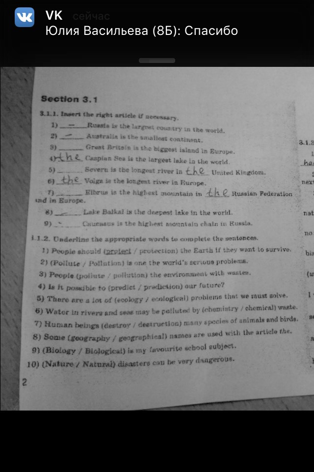 Раздел 3.1 5.1.1. Вставьте правильный ariiete у aeeussary. 1) IW в larem teatatry мире. гу Австралия является sakillest континент. GRENT Великобритания является самым большим островом Европы. 4ythe. Caapian море И.А. largeet LEKE La Whe мир 5) severu И.А. КЭ длинная река ла Соединенное Королевство. Валга в EEST реки в Rurape. Elbrun в Ахиил ЭСТа горы в унд Ruusisn Федерации в Европе. EY-Лейк Balkal самое глубокое озеро в горе 9) Caurastus является самым высоким bottntait chaln в России. я 1.2. onderlin соответствующих слов, чтобы завершить sentonces. 11 Люди должны tarpsent / ptuiection) Earta если они хотят выжить. 2) (загрязняют я Pollation) является одним серьезные проблемы в warld в. 3) Люди у загрязнения) ervironmen с wauuee, т posibir чтобы (предсказать производство) наше будущее? 4) 5) Есть целый feeology ennlogical) probiertie, что мы должны голве. Много 6) Вода IRA Ривера и морей Тай быть загрязнены (ehennintry / ehomical) wante Умань существа (уничтожить deetruetioa) tuany видов животных и Binde, 7) е (география teographiealb Nannes используются с Чет artiele на 8). 9) (биология ogical) в моей tavourite школы eubl 10 (Природа Naturai) бедствий может быть очень daagerous. 3AKPblTb
