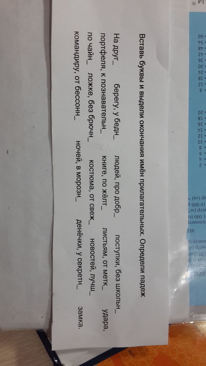 На другом (предложный) берегу, у бедных (родительный) людей, про добрые (винительный) поступки, без школьного (родительный) портфеля, к познавательной (дательный) книге, по желтым (дательный) листьям, от меткого (родительный) удара, по чайной (дательный) ложке, без брючного (родительный) костюма, от свежих (родительный) новостей, лучшему (дательный) командиру, от бессонных (родительный) ночей, в морозные (винительный) денёчки, у секретного (родительный) замка.