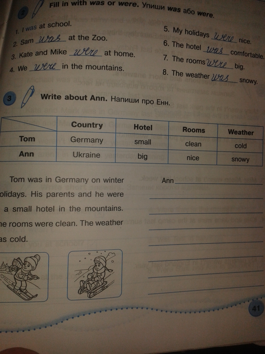 Ann was in Ukraine on winter holidays. Her parents and she were in a big hotel in the mountains. The rooms were nice.The weather was snowy.