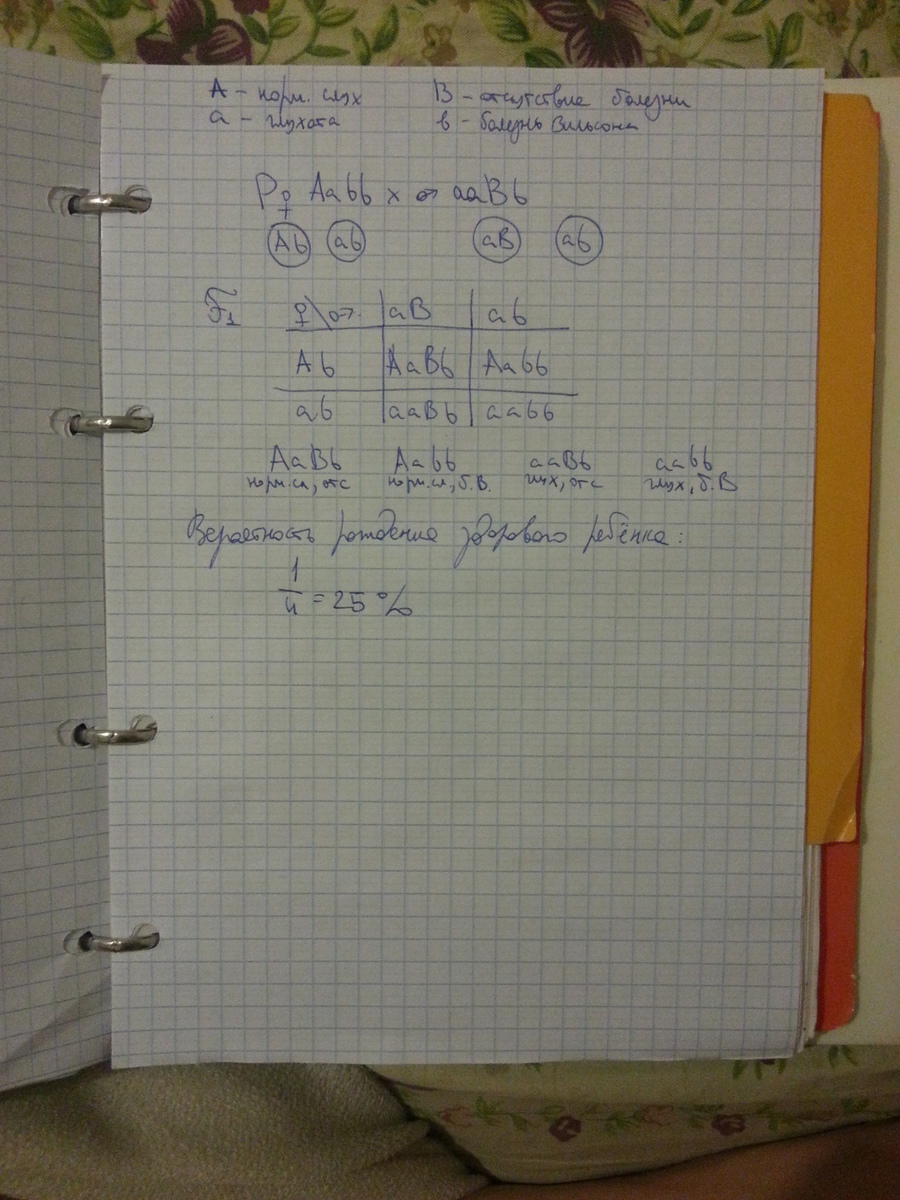 Глухота и болезнь Вильсона (нарушение обмена меди) – рецессивные признаки. От брака глухого мужчины и женщины с болезнью Вильсона родился