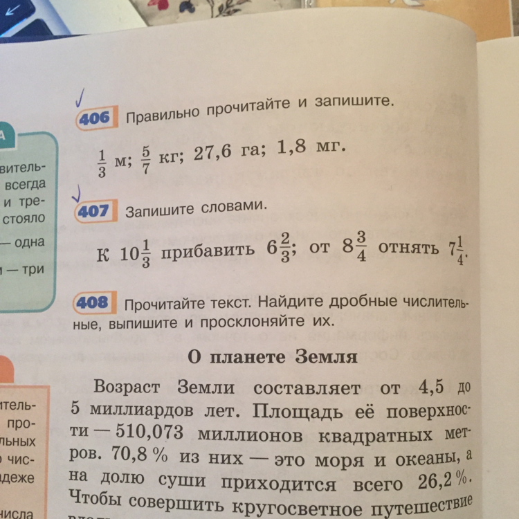 406. одна третья метра, пять седьмых килограмма, двадцать семь целых шесть десятых гектара, одна целая восемь десятых миллиграмма.