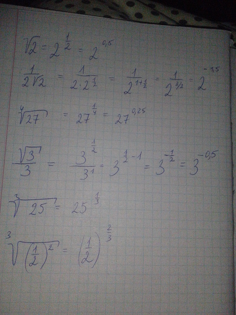 Запишите в виде степени с рациональным показателем: 1)√2 2)1/2√2 3)⁴√27 4)√3/3 5)³√25 6)³√(1/2)²