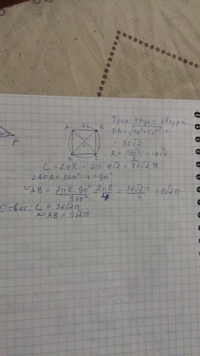 Найдите длину окружности описанного около правильного четырехугольник со стороной 36 см, и длиной дуги, соответствующей стороне четырехугольника