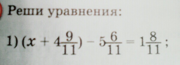 (x+4frac{9}{11})-5frac{6}{11}=1frac{8}{11} \\x+4frac{9}{11}=1frac{8}{11}+5frac{6}{11}\\x+4frac{9}{11}=6frac{14}{11}\\x=6frac{14}{11}-4frac{9}{11}\\x=2frac{5}{11}