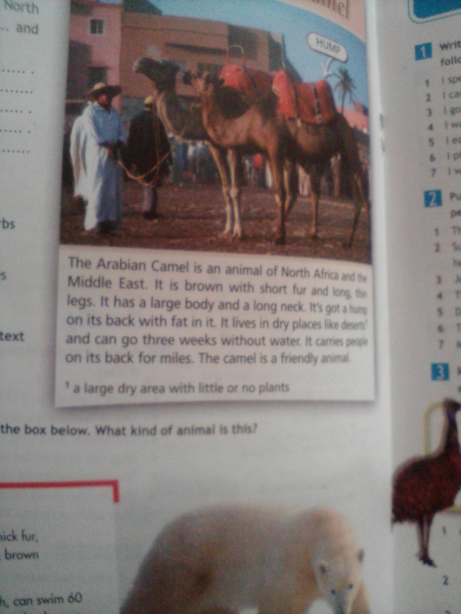 1.The Arabian Camel lives in North ....................... and in the..............