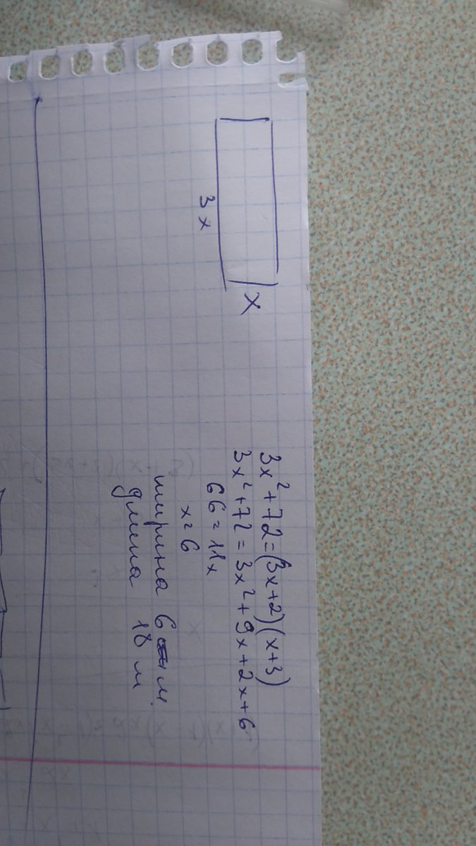 Длина прямоугольника в 3 раза больше его ширины. Если длину увеличить на 2 метра, а ширину на 3 метра, то его площадь увеличится на 72 квадратных метров. Найти длину и ширину прямоугольника.