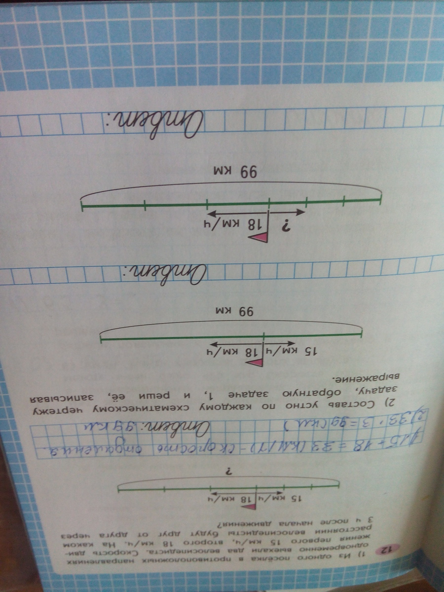 как решить 2 задачи?если первая задача решается так: 1)15+18=33(км/ч)-скорость отдаления. 2)33*3=99(км)